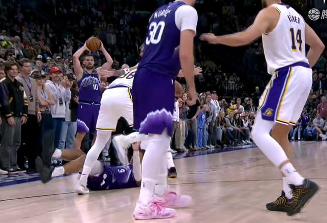 可是他们把球发出来的同时,本来准备去接球的爵士球员乔治已经被湖人队球员给推倒了,这球也没吹,这是爵士队的哈姆教练彻底暴怒的一个原因,他觉得湖人在发球之前已经犯规了。当时这个乔治被推倒在地上,本来是去接球投绝杀的,追防的斯玛特居然把对面核心放倒了,球接不到了绝杀战术自然也没有完全跑出来。