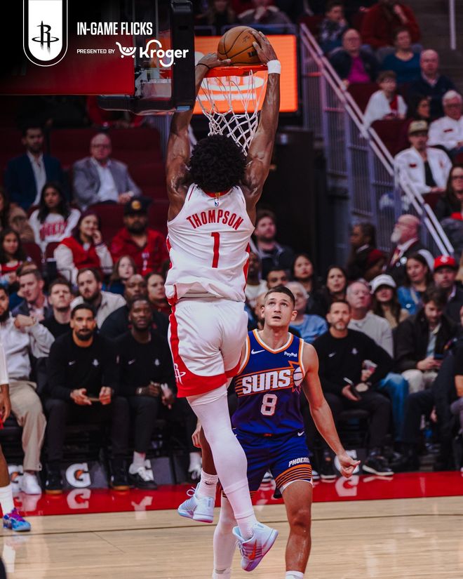 火箭队的杜兰特上半场得到21分、4个篮板和5次助攻,汤普森得到14分,史密斯得到10分;太阳队的布鲁克斯得到18分和3次助攻。
