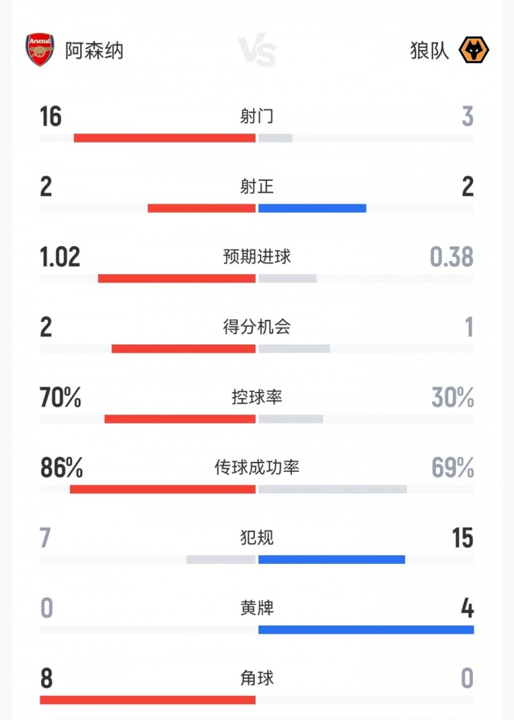 差点翻车!阿森纳2-1狼队:射门16-3射正2-2,控球7-3开,角球8-0